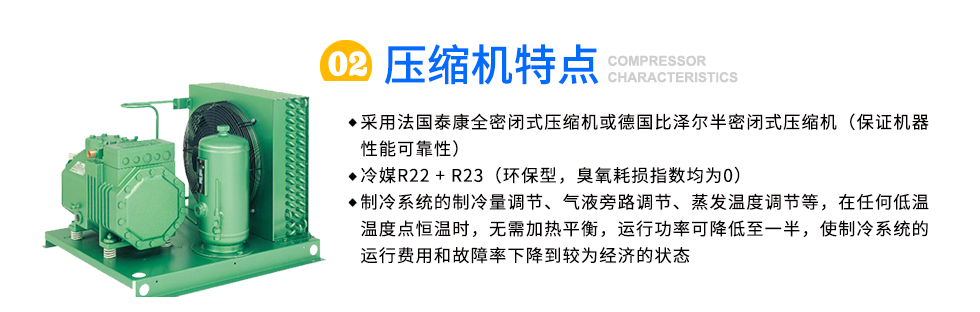壓縮機(jī): 1,采用法國泰康全密閉式壓縮機(jī)或德國比澤爾半密閉式壓縮機(jī)(保證機(jī)器性能可靠性) 2,冷媒R22 + R23(環(huán)保型,臭氧耗損指數(shù)均為0) 3,制冷系統(tǒng)的制冷量調(diào)節(jié)、氣液旁路...
